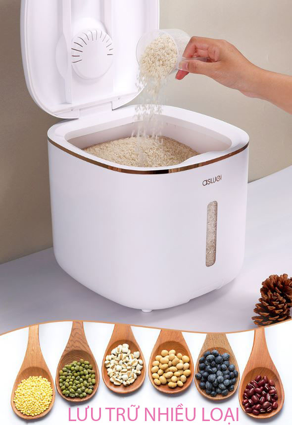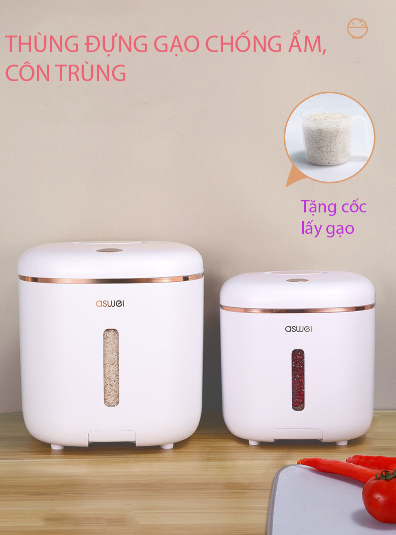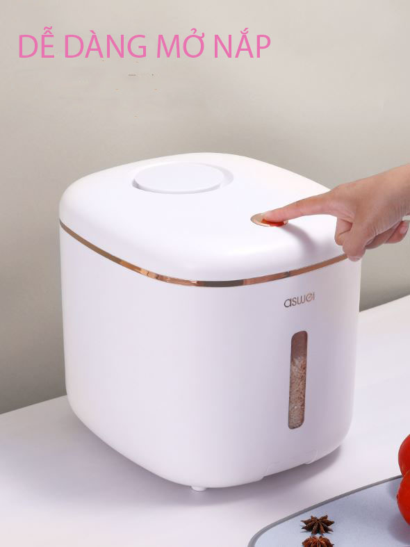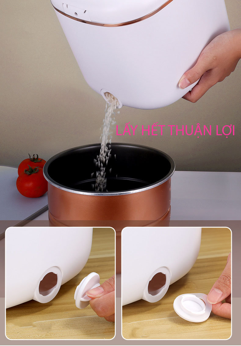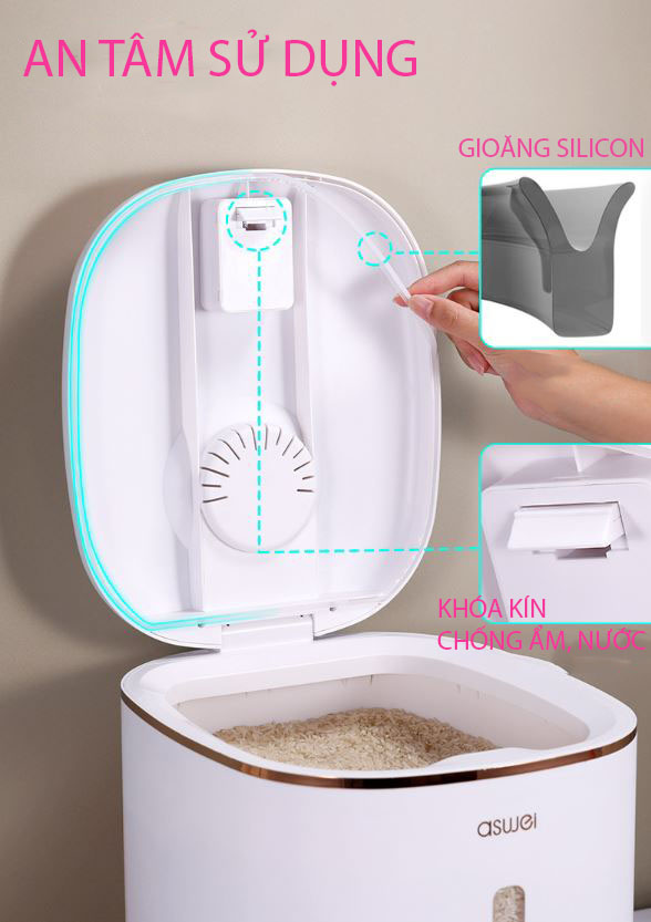 Thùng đựng gạo được thiết kế kín, chống ẩm, chống côn trùng. Mở dễ dàng. Có thể quan sát được gạo bên trong. Gioăng bằng silicon, khóa thiết kế đặc biệt chống nước và chống ẩm. Đế 2 bánh sau bằng bánh răng, dễ dàng di chuyển. Dễ dàng lấy hết gạo bằng lỗ đáy. Chất liệu nhựa không mùi, an toàn.